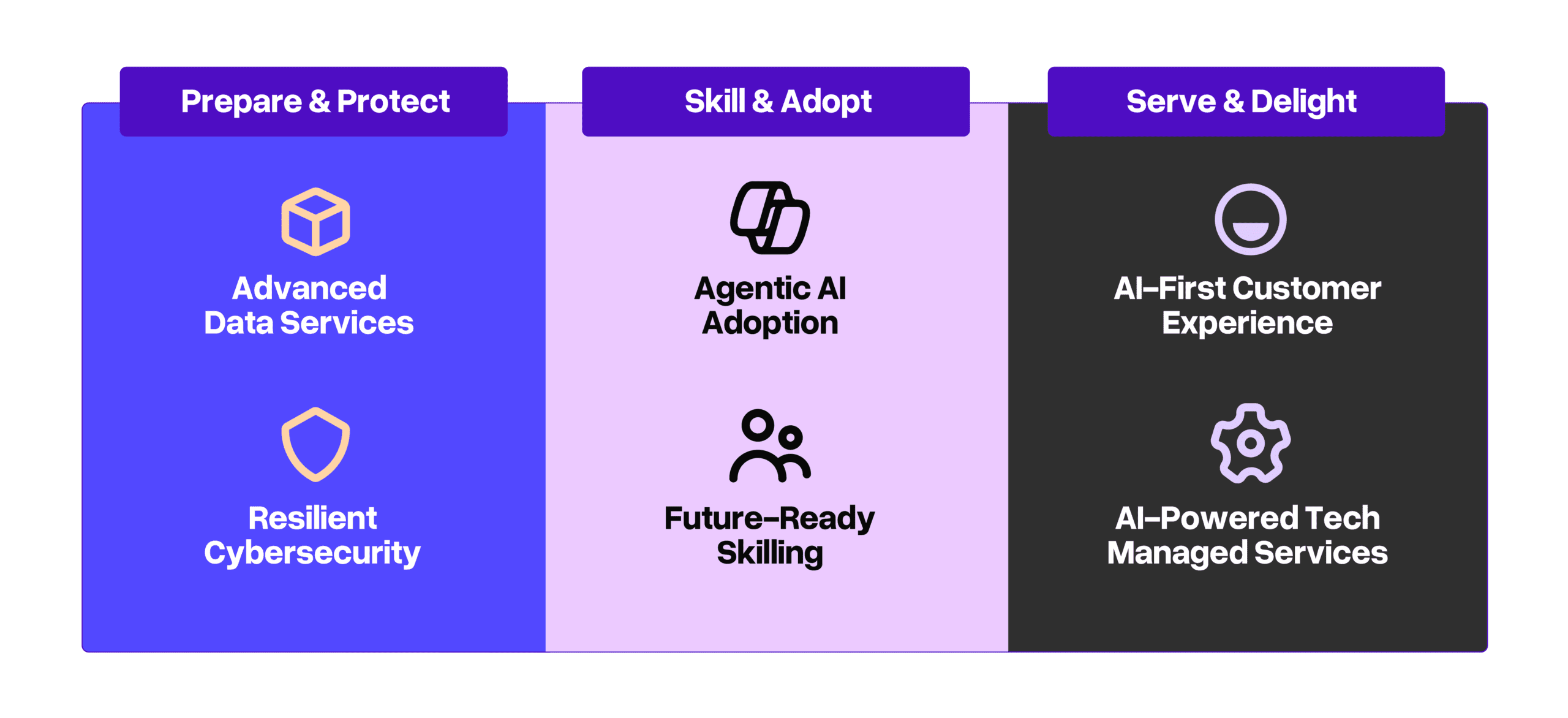 That is why our expert technology services portfolio is organized into three strategic themes—Prepare & Protect, Skill & Adopt, and Serve & Delight—shown in this framework to guide organizations from strong foundations to scaled, AI‑powered outcomes as their maturity grows.